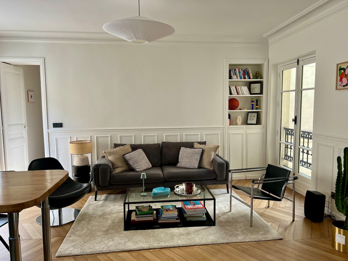 Verið velkomin í íbúðina mína í fallegri Haussmann-byggingu sem er vandlega hönnuð með arkitekt og innanhússhönnuði. Tilvalið fyrir par og eitt eða tvö börn. Íbúðin er á 3. hæð við göngugötu með öllum þeim verslunum sem matgæðingur getur látið sig dreyma um. Það er mjög auðvelt að komast að tveimur neðanjarðarlestarlínum í 2 mínútna fjarlægð og þeirri þriðju í 10 mínútna fjarlægð. Örugglega einn af bestu gististöðunum í París - mjög gott hverfi, vel tengt en ekki beint á fjölförnum ferðamannasvæðum