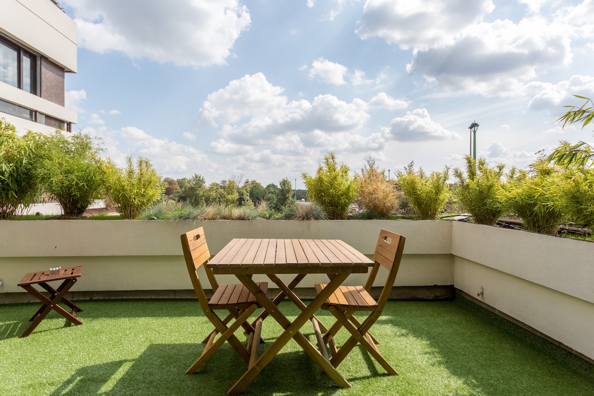 Heillandi íbúð með nútímalegum húsgögnum og stórri opni verönd með útsýni yfir Signu og Eiffelturninn. Staðsett við inngang Parísar, 15 mínútur með leigubíl frá Champs Elysées og Eiffelturninum. Stórir gluggar, snúa í suður og loftkæling. Tvö bílastæði í kjallaranum. Matvöruverslun í húsnæðinu. Sporvagn 500m í burtu, 2 stoppistöðvar frá La Défense stöðinni (RER A). Hentar pörum, fjölskyldu- og viðskiptaferðamönnum.