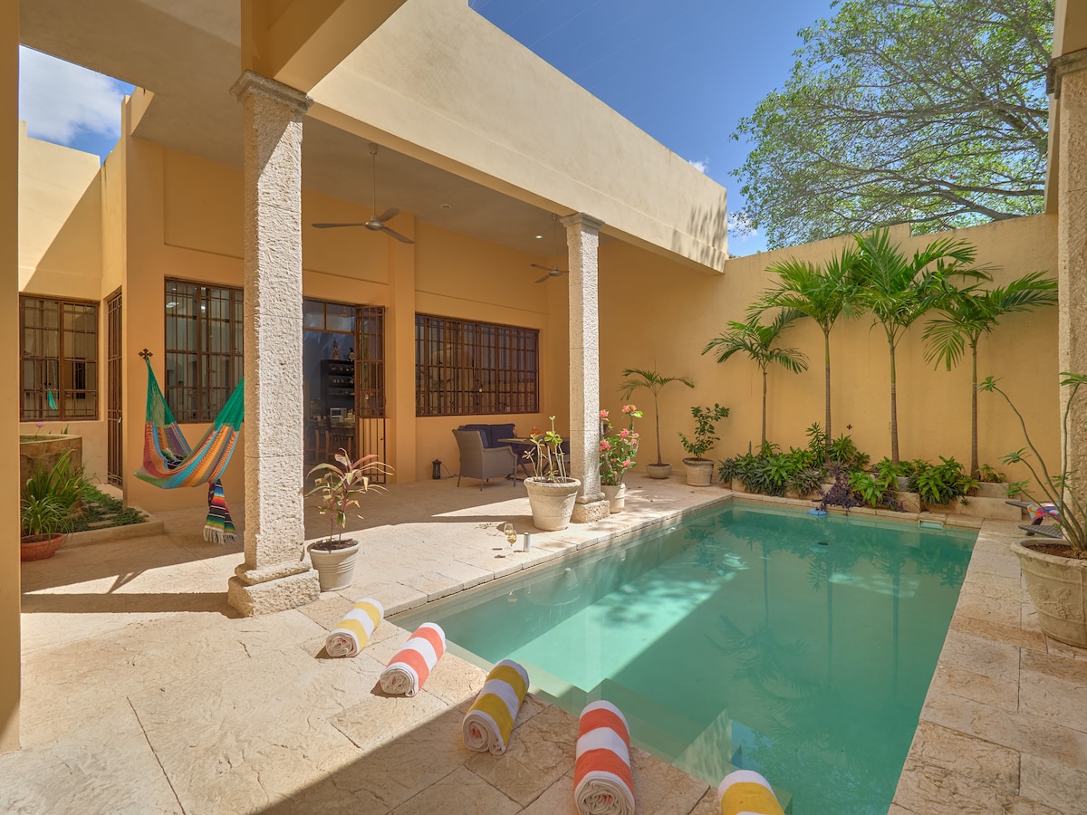 Tilvalinn staður til að skoða Yucatan eða slaka á í fallegu umhverfi. Húsið er staðsett við rólega götu í sögulega miðbæ Merida og þar er pláss fyrir allt að 6 gesti í þremur svefnherbergjum, aðskilin skrifstofa/sjónvarpsherbergi til að vinna eða leika sér og þar er stórt eldhús/stofa/borðstofa með nægri dagsbirtu. Þú getur slakað á undir pálmatrjánum við sundlaugina eða í miðjum vínviðargarðinum, grillað á þaksvölunum eða notið sólsetursins frá bjölluturninum.