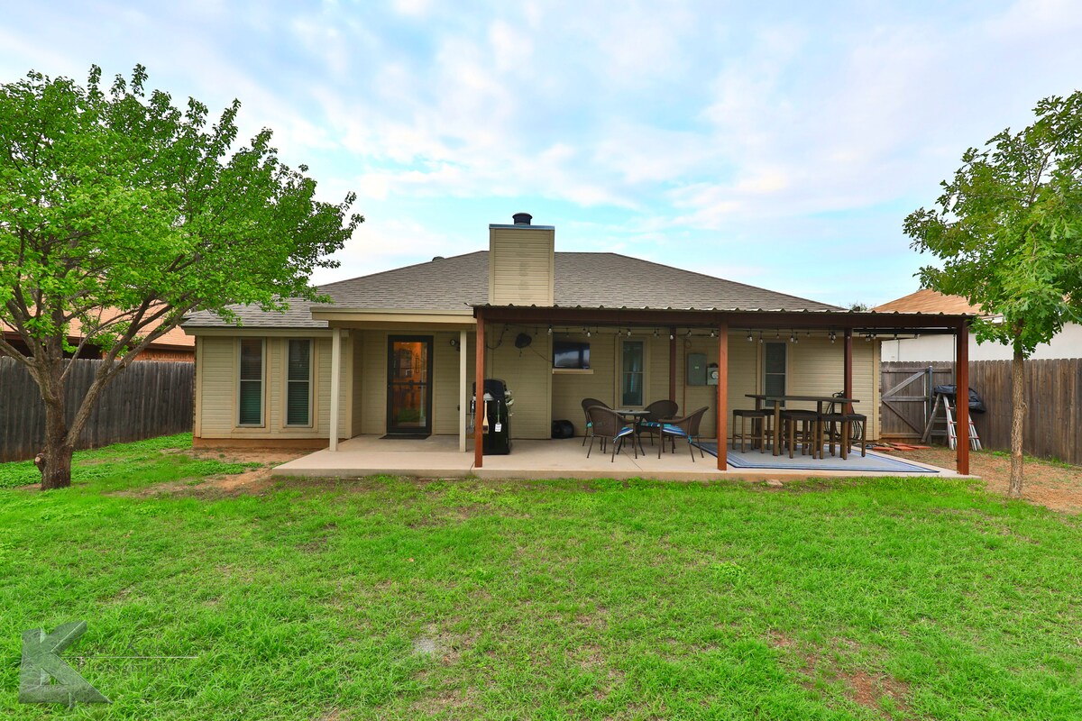 Komdu saman með fjölskyldu þinni og vinum á þessu afslappandi heimili sem er staðsett innan 1mi frá ACU. Þú munt njóta þessa þægilega 3 svefnherbergja\2 baðherbergja heimilis með gasarni og öðrum þægindum sem þú gætir þurft á að halda meðan á dvöl þinni stendur. Poolborð, leikir, grill og margt fleira í boði þér til skemmtunar. Hvort sem þú vilt sötra ferskan kaffibolla á morgnana eða njóta tónlistar með köldum drykk á kvöldin við eldstæðið. Við bjóðum ykkur velkomin á notalegt heimili okkar með gömlu íþróttaþema.