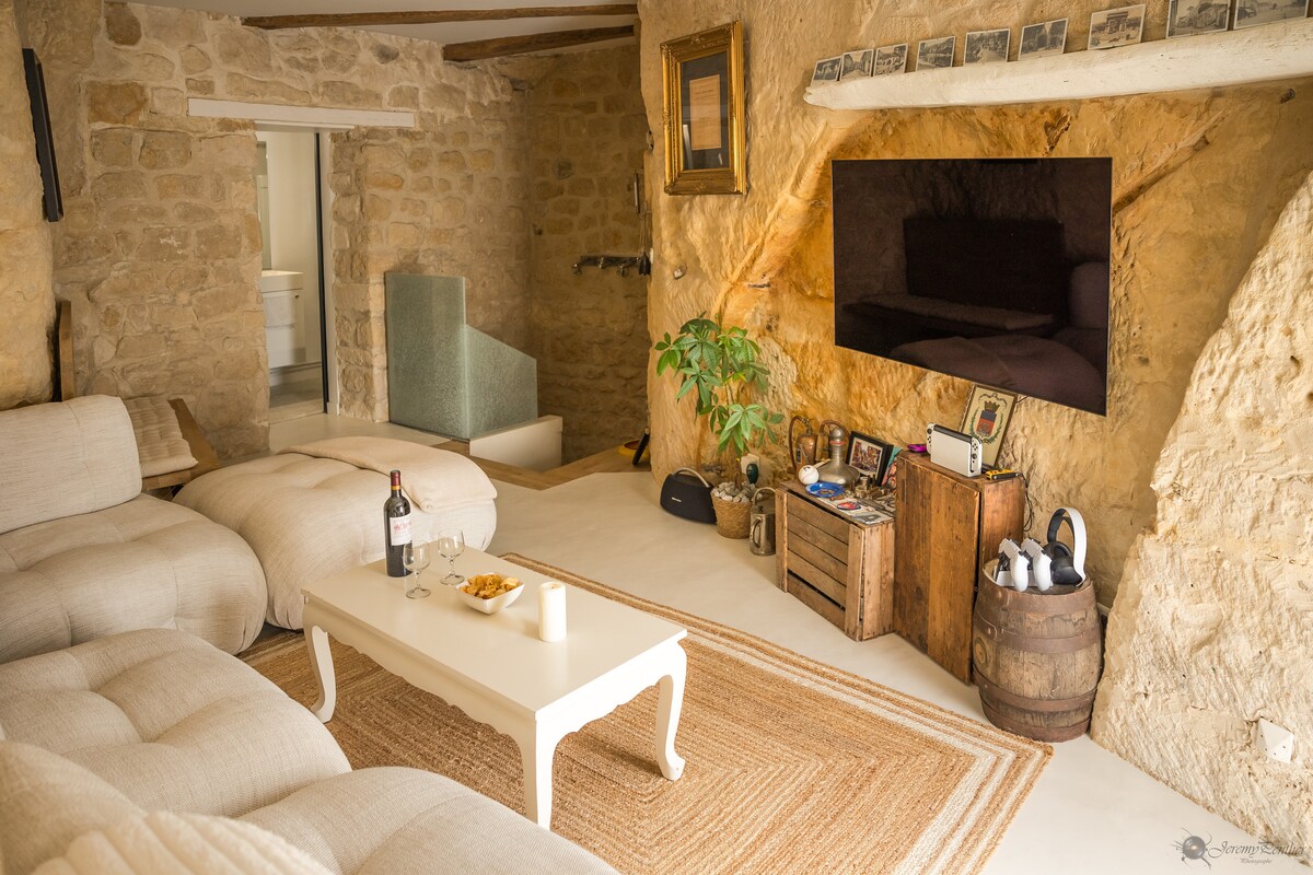 Kynntu þér þetta heillandi hús sem er skorðið í klettinn og er fullkomið fyrir dvöl tveggja: - Svefnherbergi með king-size rúmi, heitum potti með kertaljósi, stillanlegum sjónvarpi og ítalskri sturtu. - Tvær stofur með sjónvarpi, of vel búið eldhús, pelaeldavél, afþreying: Netflix, PlayStation 5, Switch, pílur... - Verönd með garðhúsgögnum. - Skrifstofurými með tvöföldum skjám og fataherbergi. Rólegur, hlýlegur og óhefðbundinn staður milli sveitalegs sjarma og nútímaþæginda.