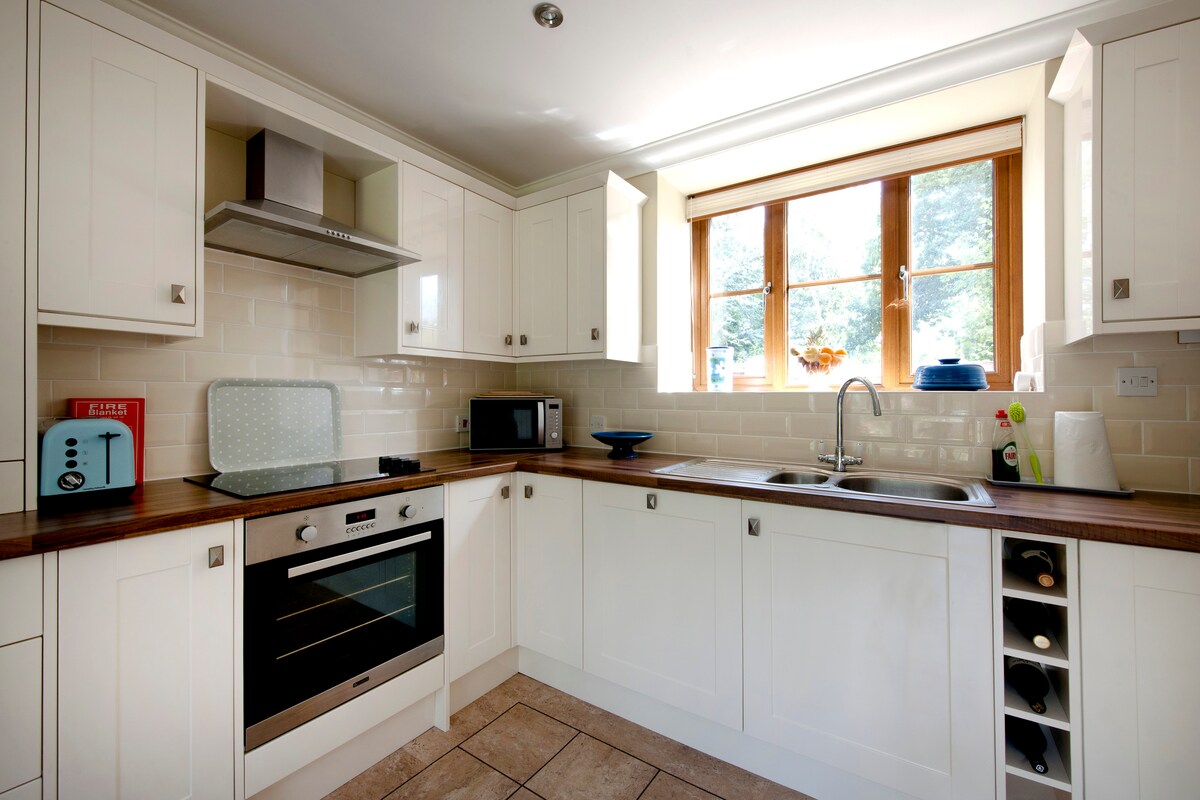 Falleg og notaleg, endurnýjuð hlöðubreyting. * Hjónaherbergi með einu king-size rúmi og en-suite (þar á meðal litlu baði með sturtu) * Tveggja manna herbergi með einbreiðum rúmum og en-suite * Opin stofa (þ.m.t. eldhús, matsölustaður og setustofa) * Viðbótarsvefnsófi (tvöfaldur) í stofu - aðeins hentugur fyrir börn til að sofa á * Snjallsjónvarp * Viðareldavél * Einstaklingsverönd en innan sameiginlegs, lokaðs húsagarðs * Sameiginlegt grasflöt * Ókeypis bílastæði á staðnum * Göngusvæði fyrir hunda * Svefnpláss fyrir 4