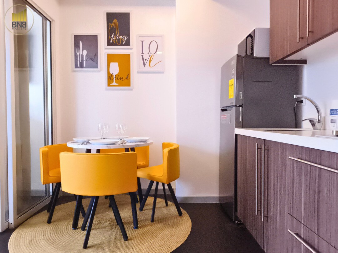One Bedroom unit at the Milano Residences Tvær loftræstingar /reykingarsvalir/fullbúið eldhús. Þetta einbýlishús er mjög notalegt og frábær staður til að skemmta sér á sama tíma. Svo þægilegt að þetta er virkilega heimili! Sameiginlega sundlaugin á neðri hæðinni og gufubaðið er í boði frá þriðjudegi til sunnudags, frá KL. 7:00 til 19:00. Sundlaugin verður lokuð á hreinsunardegi (mánudag) Bílastæði eru við Century City Mall við hliðina. Super þægilegt og 24 klukkustundir.