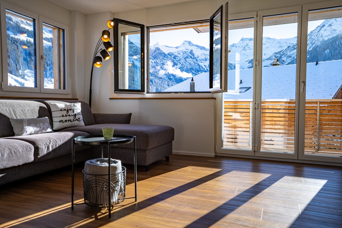 Þessi heillandi 3,5 herbergja íbúð er staðsett í miðju þorpinu og er sannkölluð gersemi Kandersteg - beint við fjallaána. Íbúðin býður upp á tvö notaleg svefnherbergi, rúmgóða stofu og bjart og einstakt gallerí. Hálfopið eldhúsið er rúmgott og vel búið og tilvalið fyrir þá sem kunna að meta samskipti við stofuna. Tvær svalir íbúðarinnar eru sérstaklega eftirtektarverðar. Báðar svalirnar eru með tilkomumikið útsýni yfir fjöllin.