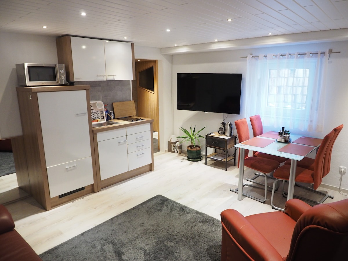 Nútímaleg og björt kjallaraíbúð með einu herbergi býður þér upp á notalegt hjónarúm, fullbúið eldhús og nútímalegt baðherbergi með þægilegri regnsturtu. Rennitjald skilur stofu og svefnaðstöðu að til að auka næði. Njóttu ýmissa aukaþæginda eins og kaffis, tes, sjampós, sápu og fleira. Róleg staðsetning, sérinngangur, þráðlaust net innifalið – fullkomið fyrir allt að 4 gesti með fljótum tengingum við Erlangen, Bamberg og Nuremberg. Komdu og láttu þér líða eins og heima hjá þér!