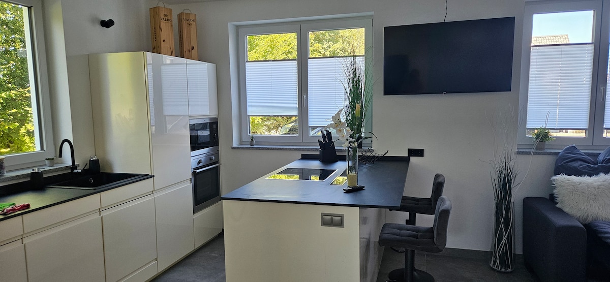 🖤 Nútímaleg hönnunaríbúð við jaðar þorpsins – kyrrðin mætir þægindum 🖤 Verið velkomin í glæsilega afdrepið þitt! Nýlokið gistirými okkar (40 fermetrar, nýbygging 2024) er hljóðlega staðsett við jaðar heillandi þorps sem er fullkomið fyrir þá sem kunna að meta afslöppun, þægindi og góð tengsl.