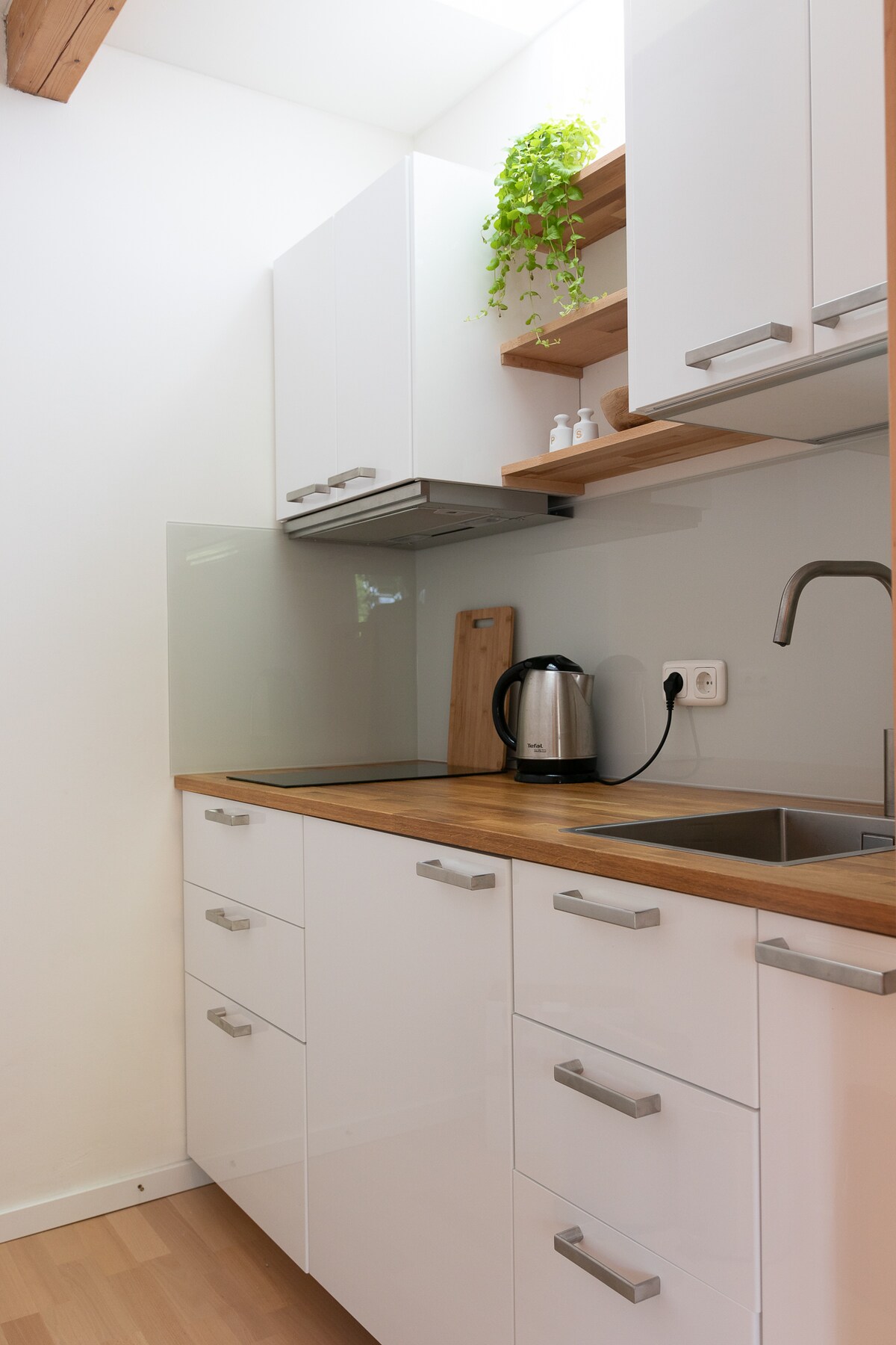 Bjart herbergi býður þér að tylla þér. Tveir notalegir hægindastólar bjóða upp á tækifæri til að lesa bók eða drekka vínglas í rólegheitum. Þægilegt hjónarúm (200 80) skapar allar aðstæður fyrir afslappaða nótt. Hægt er að útbúa máltíðir eða bara te eða kaffi í vel útbúna eldhúsinu. Nútímalega baðherbergið er með sturtu fyrir hjólastól. Boðið er upp á fjölmiðlatilboð með sjónvarpi, útvarpi og þráðlausu neti.