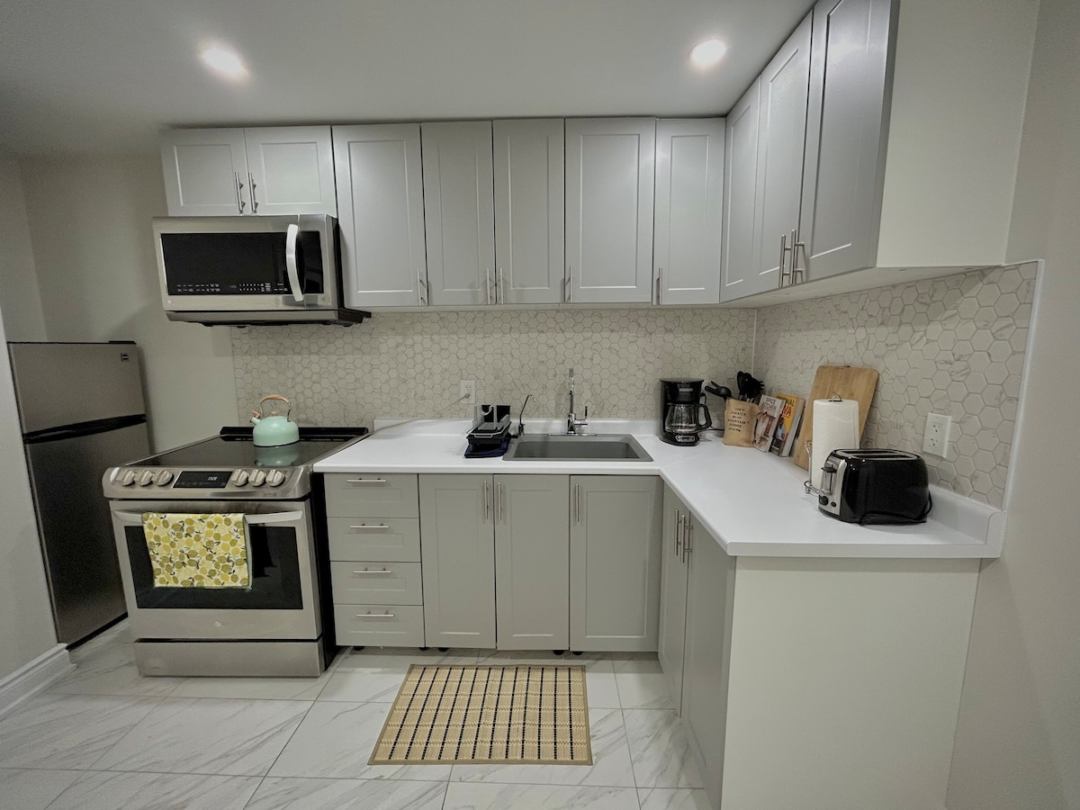 Fallegt og notalegt rými fyrir fjölskyldur sem og einstaklinga. Glænýtt, fullbúið svæði með mörgum þægindum fyrir alla fjölskylduna. 2 frábært svefnherbergi með queen-size rúmum. Jack And Jill fullbúið þvottaherbergi með ótrúlegri sturtu með líkamsþotum. Fylgir allar bjöllur og flautur. Opin hugmynd með stofu, borðstofu, fullbúnu eldhúsi, þvottavél og þurrkara, ókeypis bílastæði, vinnusvæði sem hentar vel fyrir fjarvinnu og mörgu fleiru…. ENGIR ÓSKRÁÐIR GESTIR ERU LEYFÐIR SAMKVÆMT HÚSREGLUM.