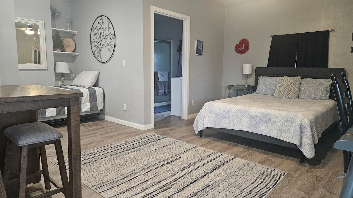 * Casita fest við nýtt heimili -- Engir stigar * Einkaverönd * King size rúm fyrir 2 fullorðna, lampar við rúmið með hleðsluvalkostum og innstungum, spegill í fullri lengd og stór kommóða * Sófi, þreföld dýna úr minnissvampi, pac-n-play og vindsæng í boði fyrir allt að 2 fullorðna í viðbót í stofunni * 100 MBS þráðlaust net, snjallsjónvarp * Keurig með hylkjum: KOFFEINLAUST, venjulegt, te, kakó * Lítill ísskápur/frystir, örbylgjuofn, rafmagnsteketill * Deluxe sturtu sproti, blása þurrkara * Tvöfaldur skápur, straujárn og strauborð