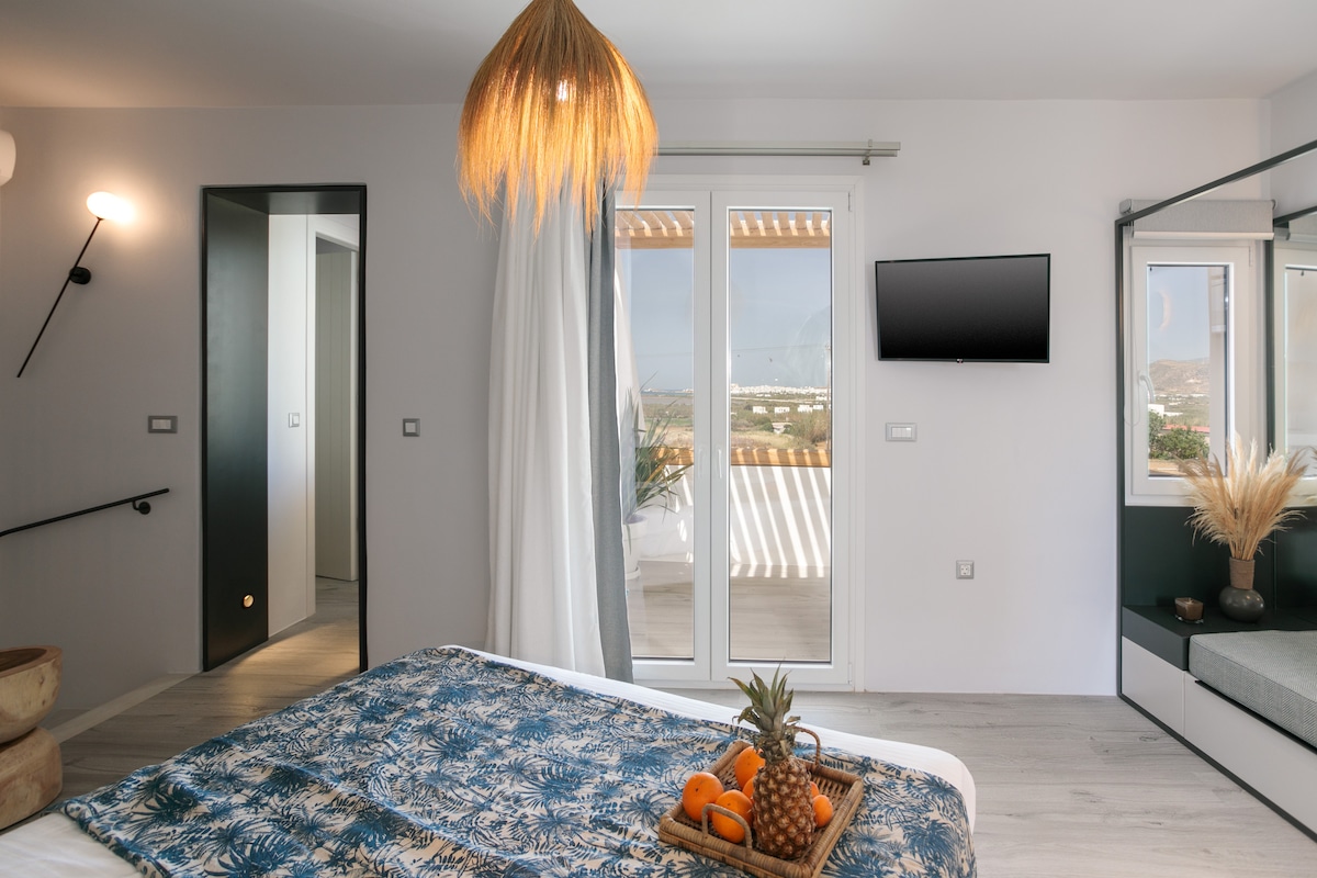 Opnaðu sjávarbláu hlerana og hleyptu inn kæligolunni og fáðu þér svo snarl við steypta eldhúsborðplötuna í blæbrigðaríku afdrepi við vatnið. Stígðu út á rúmgóða, laufskrýdda veröndina til að fá rólega sólsetursdrykki með óhindruðu sjávarútsýni! Íbúðin er staðsett við hliðina á sandströnd til að synda á morgnana og í 2 mínútna göngufjarlægð frá miðbæ Naousa og aðaltorginu. Verslanir, veitingastaðir, barir og klúbbar eru í göngufæri en svæðið er samt mjög rólegt og rólegt!