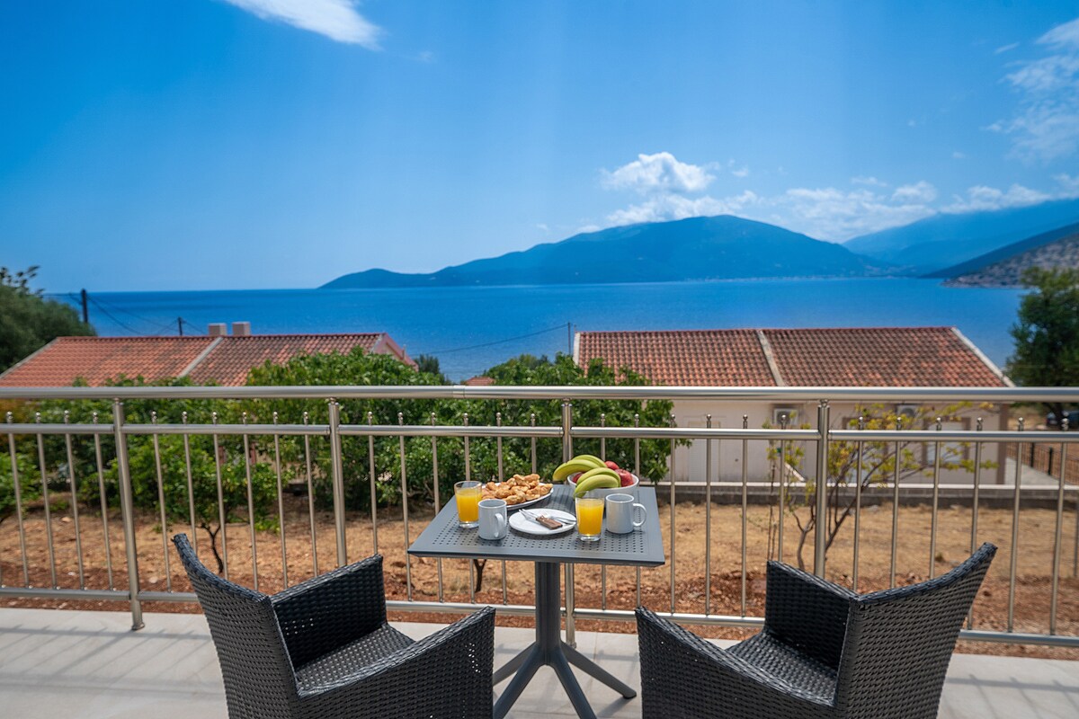 Fallega staðsett á upphækkuðum hluta Agia Efimia lúxusíbúðin okkar, sem var nýlega enduruppgerð (2021), með tveimur svefnherbergjum, baðherbergi, fullbúnu eldhúsi, stórri bjartri stofu / borðstofu og nokkuð rúmgóðum svölum býður upp á magnað útsýni yfir fallegu höfnina og fjallið umhverfis hana. Gestirnir hafa tækifæri til að flýja daglegan veruleika og slaka virkilega á og njóta hins endalausa bláa jóníska hafs með opnu útsýni til nágrannaeyjunnar Ithaca.