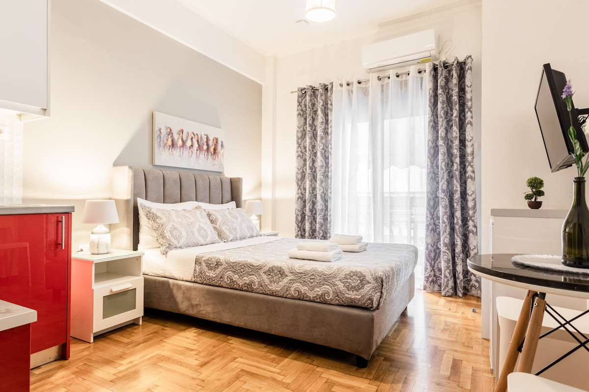 Íbúð í nýjum og nútímalegum stíl ,björt og hrein í sígildu hverfi í Aþenu með ókeypis bílastæði. 5 mínútna göngufjarlægð frá neðanjarðarlest Kato Patissia , 15 mín frá Acropolis og 25 mín frá Pireus og 10 mín frá miðbænum. Allt sem þú gætir þurft er nálægt þér ,matvöruverslanir,veitingastaður hinum megin við götuna,bakarí og ávaxtabúð. Matvöruverslun og staðbundinn skyndibiti og hefðbundnir veitingastaðir ,barir og kaffibarir. Nýtt hitakerfi með loftræstingu og ofnum sem virkar fullkomlega