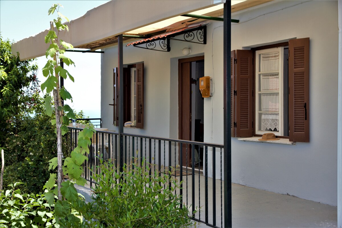 Íbúð á jarðhæð í hefðbundnu tveggja hæða húsi. Garðurinn er með eigin garð með grilli og viðarofni ásamt frábæru fjalla- og sjávarútsýni. Það er með einu svefnherbergi og getur hýst allt að fimm manns. Gestir á jarðhæð geta notið útisvæðisins, garðsins, veröndinnar og grillsins. Einu sameiginlegu rýmin eru bílastæðið og þvottahúsið í skúrnum. Húsið er í 5' göngufjarlægð frá torginu Kissos og 15' frá ströndum Pelion.