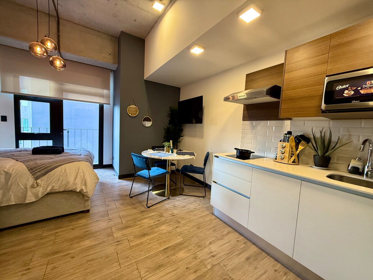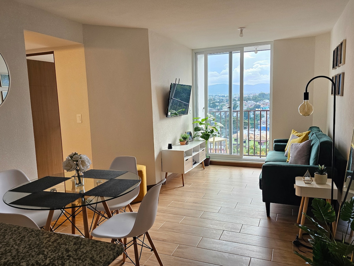 Íbúð með 2 til 1 svefnherbergi til að bjóða upp á frábært andrúmsloft og frábært útsýni yfir bæinn og eldfjöllin. Meira en 85 m2 er með fyrsta flokks búnaði og skreytingum. Við erum með upphitaða sundlaug á 31 C, fullbúna líkamsræktarstöð, félagssvæði á 25. hæð sem eldgryfja; sem og matvörubúð, snyrtistofa og bekkur í anddyrinu. Staðsett á hótelsvæði borgarinnar eða Zona Viva í göngufæri frá bestu sjúkrahúsunum, veitingastöðum og verslunarmiðstöðinni