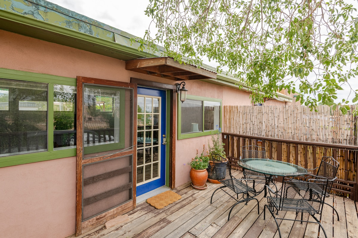 You'll love staying in one of our cities' most interesting neighborhoods. We are are centrally located in a local arts neighborhood, just 1.8 miles from the plaza and not far from Meow Wolf & main museums. If you want to stay in the touristy historic district-- not us. Also, no TV; but stream on 300 MPS wifi. Your super clean, elegant room, full of eclectic art, has a comfy king size bed, full kitchen, fridge, couch, table & private deck-- perfect for catching exquisite sunset views.