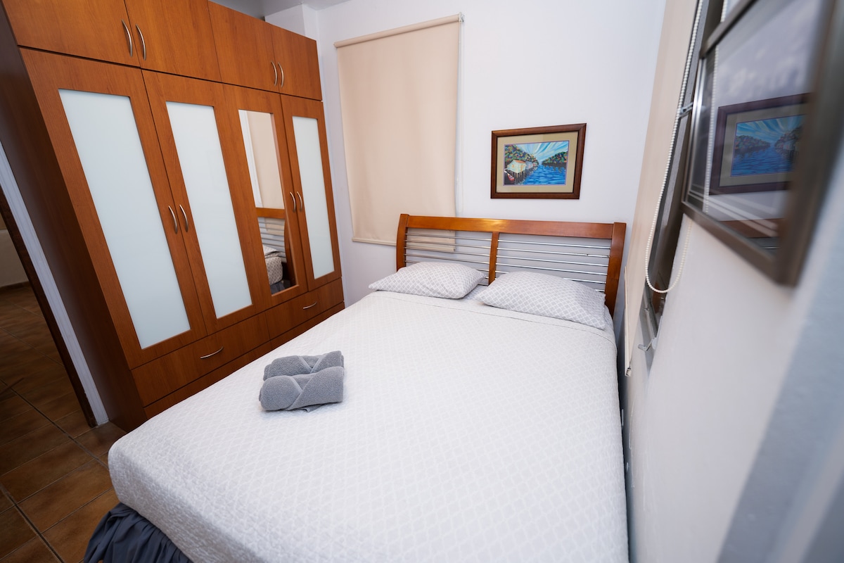 Lítið stúdíó mjög vel staðsett. Nálægt Rincon og Isabela. Auk þess erum við með fleiri strendur en nokkur hluti af eyjunni. Íbúðin er fullbúin. Öruggt, þægilegt, eitt queen-rúm, loftræsting, kapalsjónvarp, þráðlaust net, heitt vatn. Tvöfaldur inngangur með handriðum, Það er satt að það er hávaði á morgnana. Við erum staðsett í miðbænum. Sumir koma snemma til að sinna opinberum pappírsvinnu; það eru líka dæmigerð fyrirtæki í bænum eins og kaffihús sem eru opin snemma.