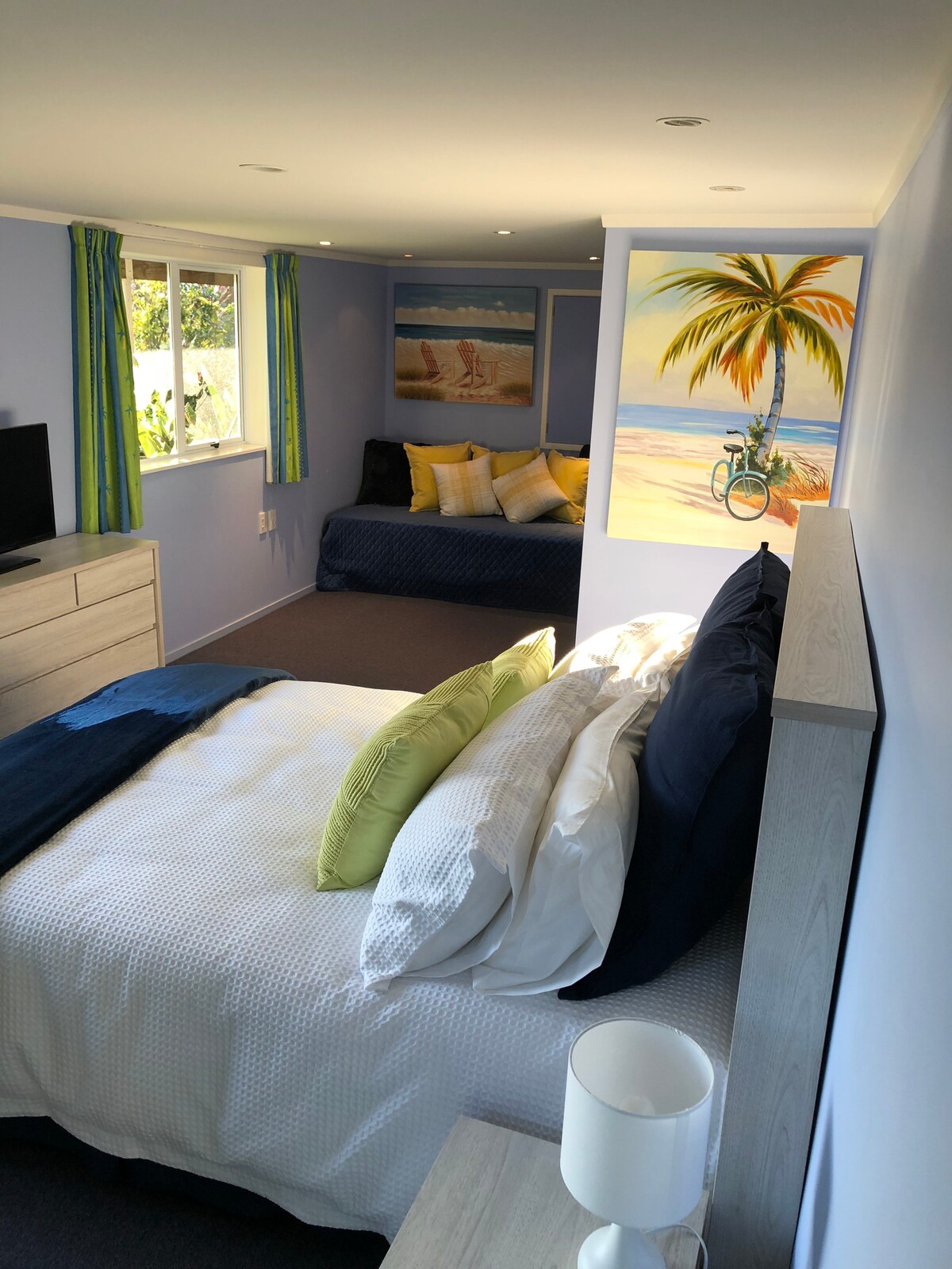 Nútímaleg íbúð á jarðhæð í húsinu okkar sem samanstendur af 2 svefnherbergjum (queen-rúm hvort) dagherbergi með eldhúskrók (engin eldavél) og sjónvarpi (Netflix). Gakktu inn um útidyrnar á húsinu okkar með hurð að gistiaðstöðunni í innganginum. Svefnherbergi með svörtum gluggatjöldum. Aðskilið baðherbergi með sturtu og salerni. Þvottavél og þurrkari í boði. Bílastæði við götuna fyrir 1 bíl, ÞRÁÐLAUST NET, stutt á litlu ströndina hennar Ahuriri, veitingastaði og kaffihús.