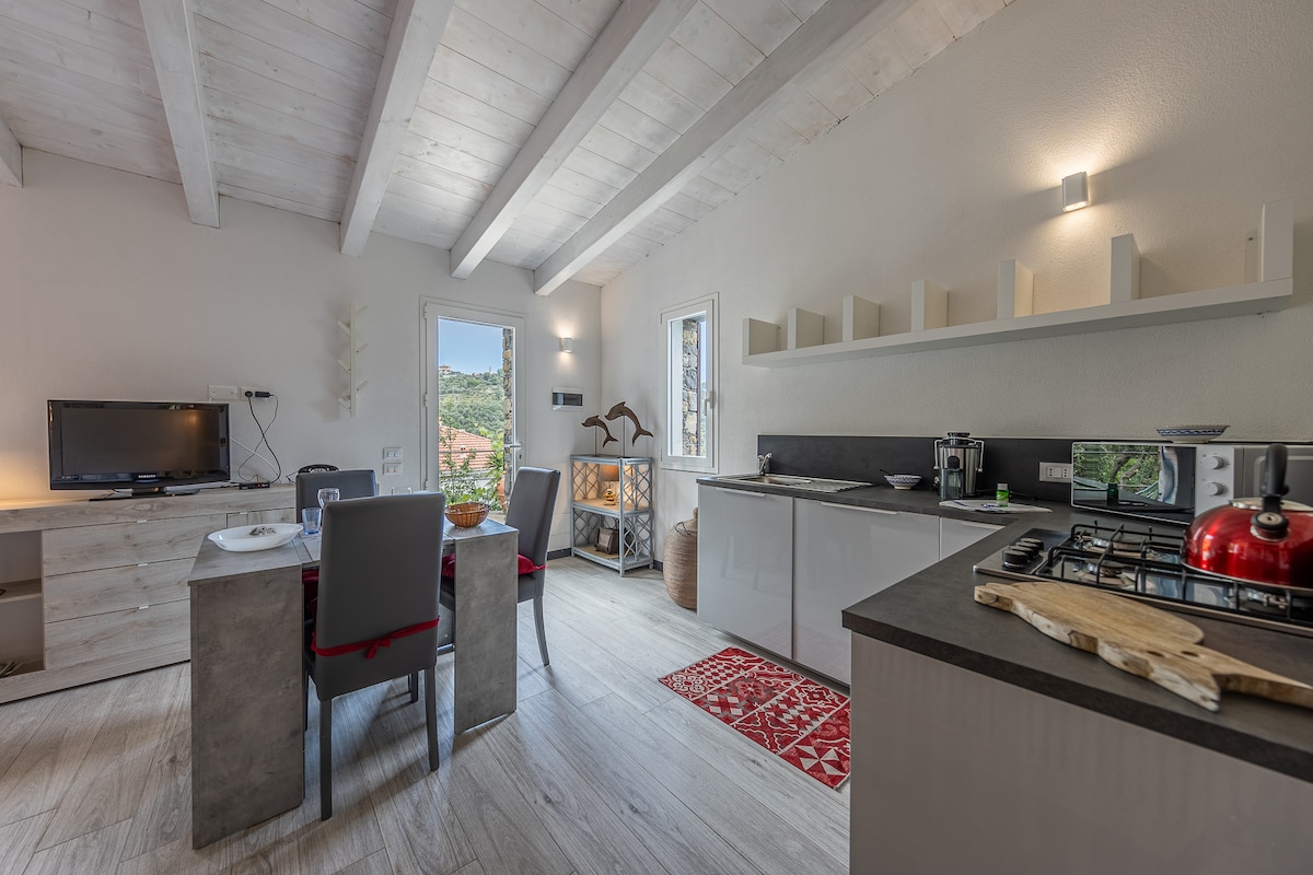 Villa umkringd gróðri og dæmigerðum lígúrískum ólífutrjám. Inni í litla almenningsgarðinum er yndisleg pergola með stóru, mjög rúmgóðu eldhúsi og notalegum arni. Húsið er á tveimur hæðum með 3 svefnherbergjum, 3 baðherbergjum og stórri stofu með eldhúskrók. Þú hefur aðgang að honum frá 2 inngöngum með 3 bílastæðum. Þráðlaust net. Loftræsting á 2 hæðum. Sjórinn er í innan við 5 mínútna göngufjarlægð. Gistináttaskatturinn er € 2,50 á mann sem er eldri en 15 ára.