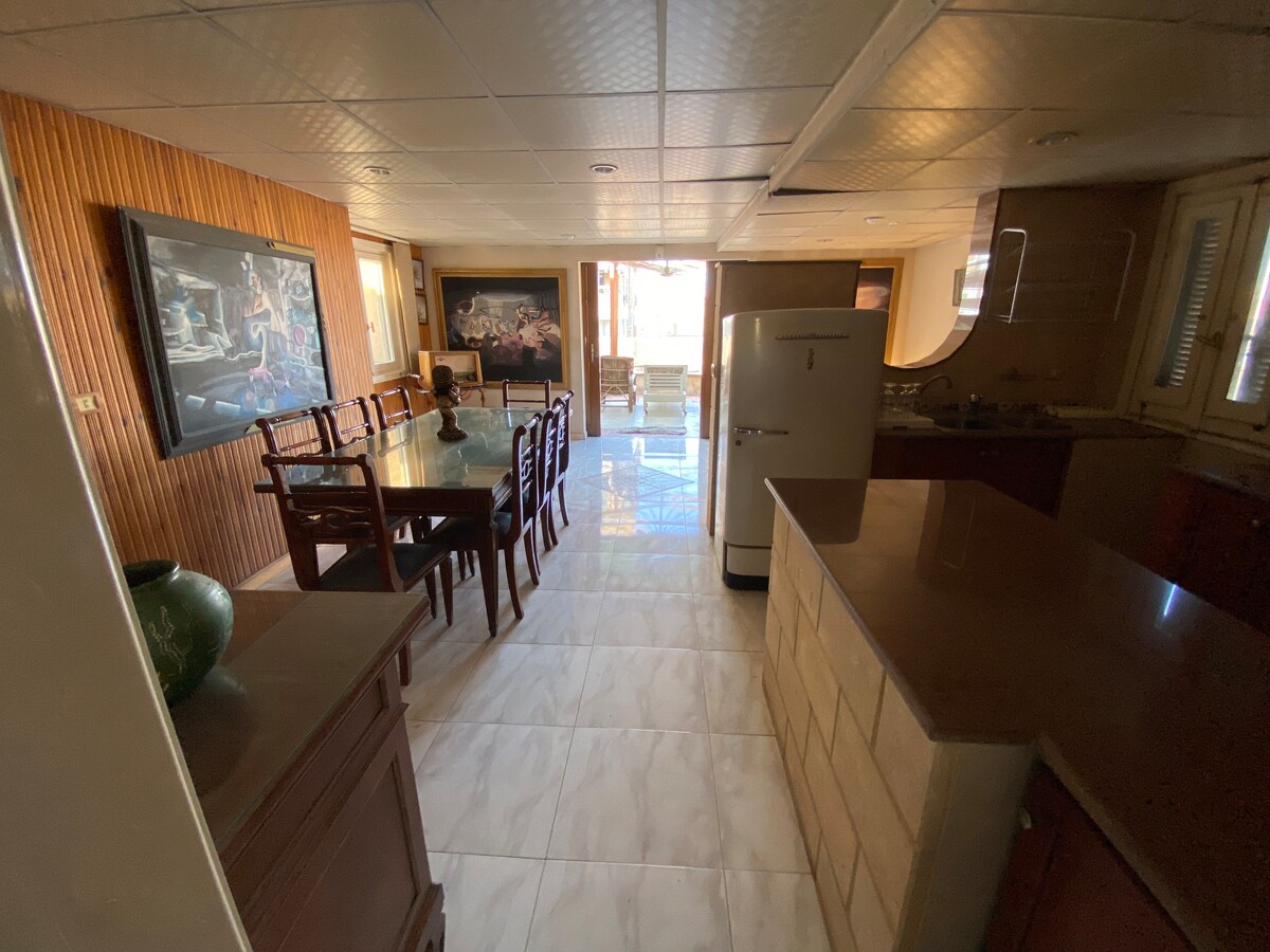 Vintage-íbúð síðan 1946 í bland við nútímaþægindi á frábærum stað í aðeins 9 mínútna fjarlægð frá flugvellinum. King size rúm ásamt svefnsófa. Þó að það sé engin lyfta veitum við hins vegar ókeypis farangursaðstoð við inn- og útritun. Göngufæri fyrir 2 neðanjarðarlestarstöðvar Tilvalið fyrir pör sem eru einir á ferð. Þú finnur lúxus líkamsræktarstöð, apótek og matvöruverslanir í burtu. 10 mínútna göngufjarlægð frá El Korba-héraði sem er fullt af fínum veitingastöðum, kaffihúsum og verslunum
