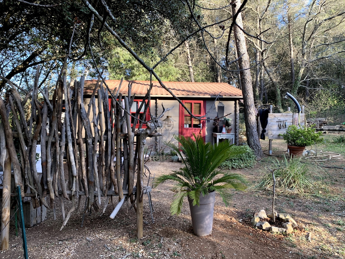 Chalet en bois indépendant avec cuisine, salle de bain avec douche, lavabo, toilettes sèches et chambre mansardée. Entouré du jardin, sans vis à vis, calme, en pleine nature, face à la montagne Sainte Victoire où vous pouvez vous reposer en toute tranquillité. Vous disposez d'un barbecue à gaz, table, chaises et fauteuils d'extérieur. L'accès à la piscine de la propriété est autorisé et non limité.