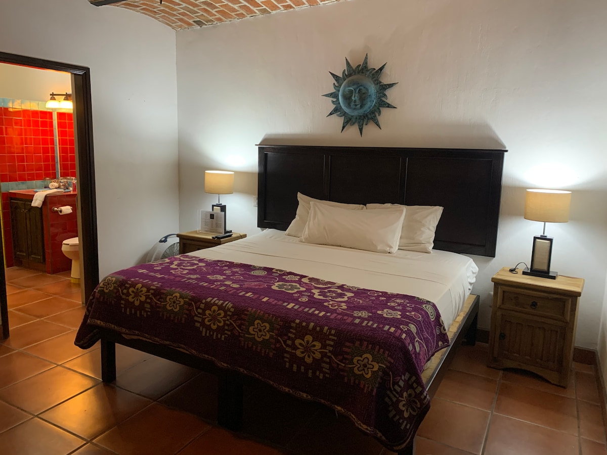 Ósvikin mexíkósk casita í hjarta Ajijic-þorpsins, fullkomlega staðsett til að skoða fótgangandi. Svefnherbergið á efri hæðinni er með queen-size rúmi (60" x 80"), hvelfingu, arineld og svalir með fjallaútsýni. Notaleg stofa, flatskjásjónvarp, frábært þráðlaust net og vel búið eldhúskrókur með gaseldavél og fullstórum ísskáp. Nýtt heitt vatn eftir þörfum, síunarkerfi, frábær vatnsþrýstingur, sturtuhaus með regnsturtu. Fullkominn staður til að slaka á eftir dag í þorpinu.