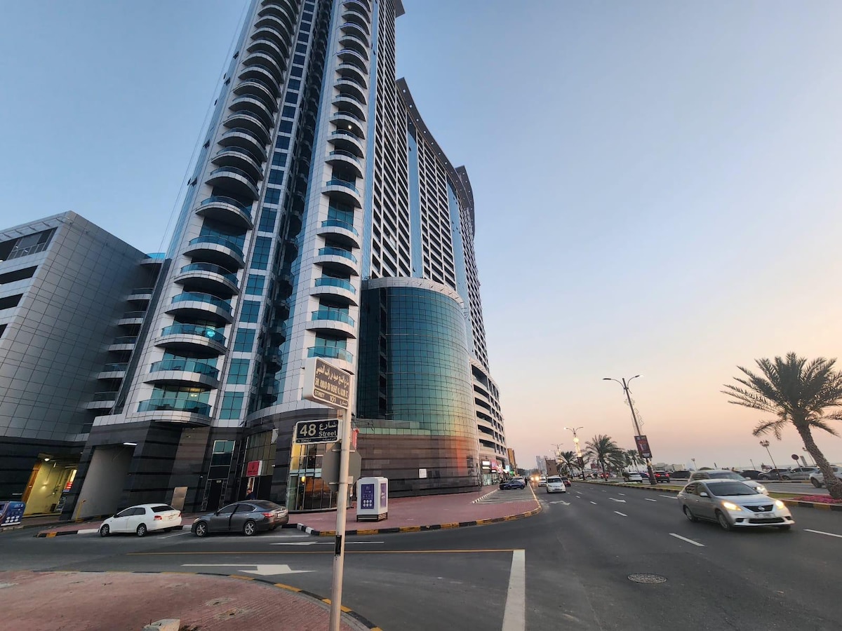 EKKI MISSA AF! FALLEGU ALLRI STÚDÍÓÍBÚÐINNI OKKAR, BEINT Á AJMAN CORNISH MEÐ FRÁBÆRU SJÁVAR- OG STRANDÚTSÝNI. Betri staðsetning, fallegt samfélag í hjarta Ajman Corniche, er þekkt fyrir nálægð sína við ströndina. Veldu úr hundruðum daglegra athafna og kaffihúsum í nágrenninu, veitingastöðum, börum, snyrtistofum og matvöruverslunum allan sólarhringinn áður en þú ferð á sandinn aðeins 15 metra frá innganginum. Hvert húsnæði er einstaklega vel skipulagt og skreytt með öllum innri eiginleikum.