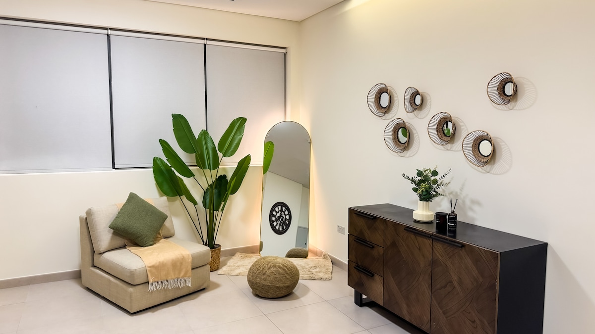 Verið velkomin í íbúðina okkar með einu svefnherbergi, í 8 mínútna akstursfjarlægð frá ströndinni. Njóttu bjartrar stofu með sófa og sjónvarpi, 2 baðherbergjum og fullbúnu eldhúsi. Ókeypis WiFi. Þægilegt herbergi fyrir góðan nætursvefn. Nálægt matvöruverslunum, veitingastöðum og verslunum með greiðan aðgang að samgöngum. Er með ókeypis bílastæði Allir gestir verða með bílastæðakortið en ef það tapast þarftu að greiða 300aed