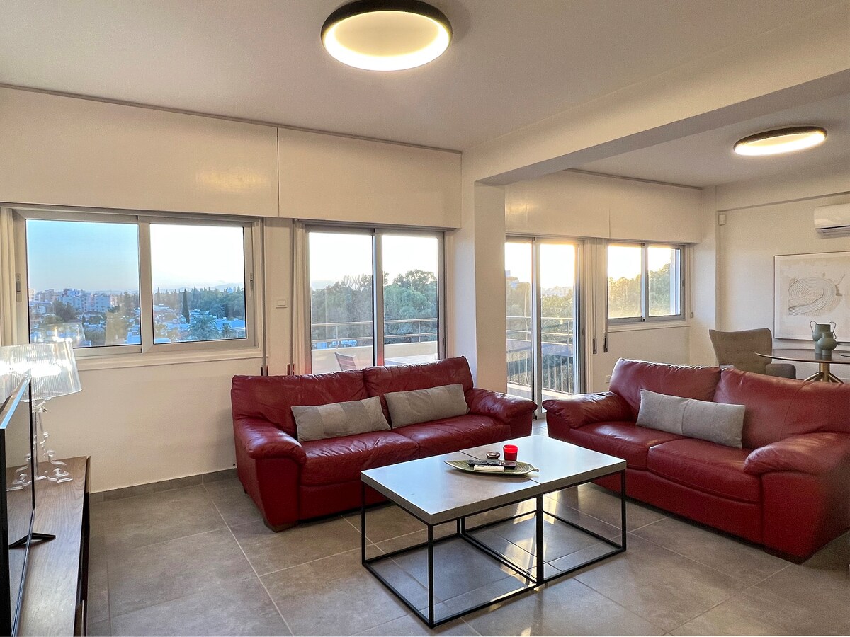 Verið velkomin á friðsæla nýja heimilið þitt í miðborginni. Öll herbergin eru með grænu útsýni og borgarútsýni. Íbúðin er nýbyggð, fullbúin með öryggismyndavélum og öll húsgögn eru glæný. Hún er tilvalin fyrir pör, fjölskyldur og ferðalanga sem eru einir á ferð. Það er nálægt Dereboyu Street og öllum verslunarsvæðum og verslunum. Grand Pasha Nicosia Hotel & Spa er í 6 mínútna göngufjarlægð.Merit Nicosia Hotel Casino & Spa er í 6 mínútna göngufjarlægð. Gamlir borgarmúrar eru í 25-30 mínútna göngufjarlægð. Strætisvagnastöðvar eru í 5 mínútna fjarlægð.