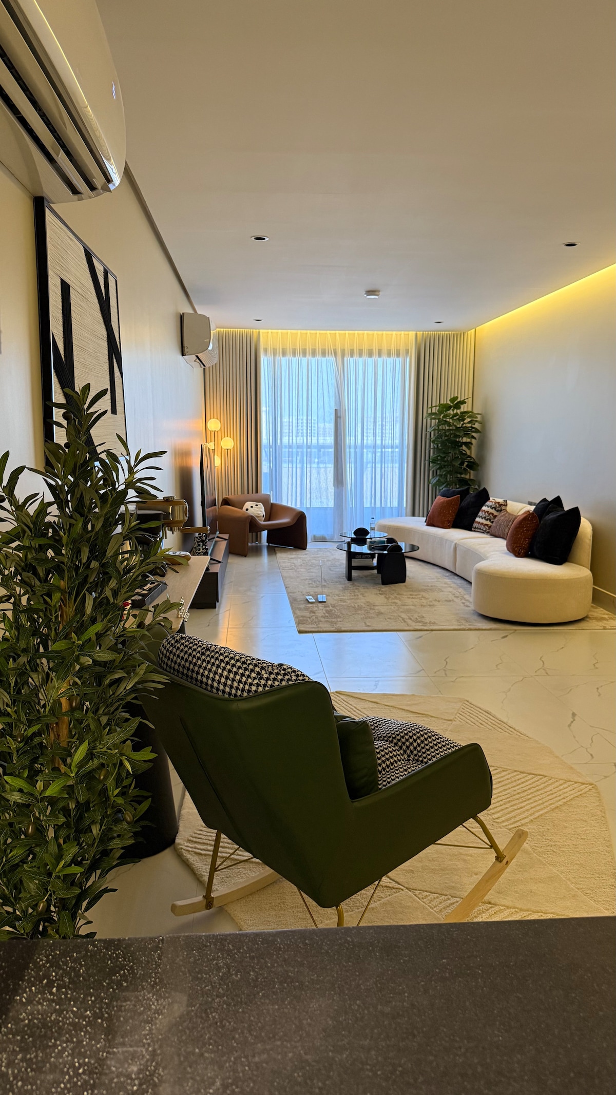 Uppgötvaðu einkennandi dvöl í þægilegri íbúð í borginni Al Khobar. Íbúðin státar af nokkrum eiginleikum: 1. Snjallt og öruggt aðgengi í gegnum snjalldyralás. 2. Fallegar svalir með útsýni. 3. Kaffihorn með kaffivél, örbylgjuofni og litlum ísskáp. 4. 4K snjallskjár. 5. Hröð 5G nettenging. 1. Barein brúin - innan 5 mínútna. 2. Rashid Mall - 10 mínútur. 3. Við vatnið - 5 mínútur.