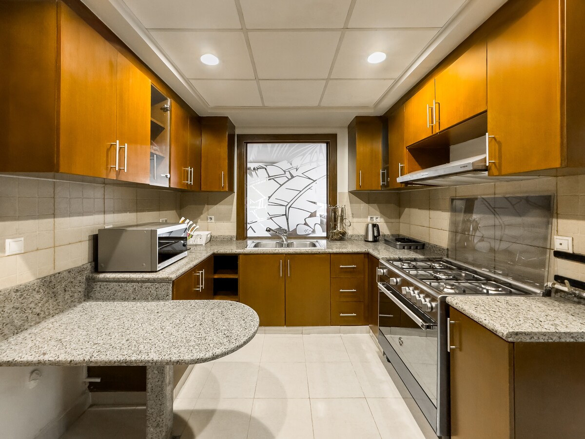 Upplifðu hið fullkomna í nútímalegri þægindum í nýrri 2 herbergja og 2 baðherbergja íbúð sem hentar fyrir 4 manns. Hver einn tommi af þessu stílhreina rými er nýr og hannaður til að gera dvöl þína ógleymanlega Íbúðin okkar er fullkomin fyrir fjölskyldur eða vinnuferð. Þú finnur öll þægindin sem þú þarft, þar á meðal fullbúið eldhús og þægilega stofu Staðsett í frábærri samstæðu, þú ert bara stutt frá veitingastöðum, verslunum í Tagamoa og Naser borg Bókaðu núna. Við hlökkum til að taka á móti þér!
