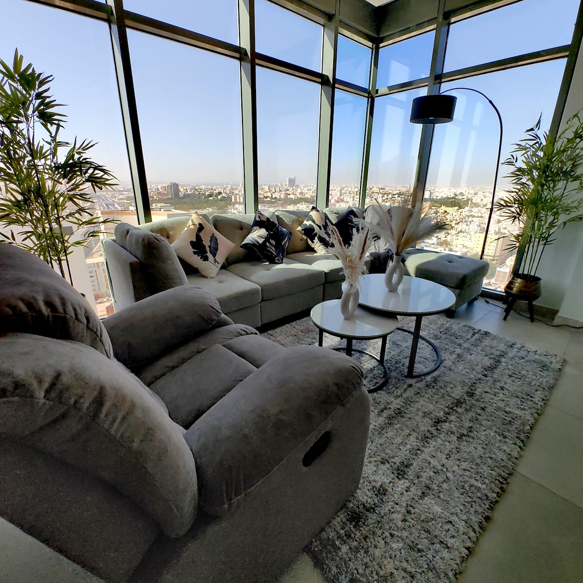 Gaman að fá þig í lúxusafdrepið þitt í hjarta Barein! Þessi íbúð með 1 svefnherbergi er staðsett á 24. hæð í nútímalegu háhýsi og býður upp á magnað útsýni yfir borgina. Fjölskylduheimilið okkar er hannað fyrir þægindi og stíl og býður upp á nútímalegar innréttingar, fullbúið eldhús og öll þægindin sem þú þarft fyrir afslappaða dvöl! Vaknaðu við magnað útsýni, slappaðu af í rúmgóðu stofunni og njóttu snjallheimiliskerfisins okkar með því að nota Alexu til að stilla og breyta gluggatjöldum, sjónvarpi og hurðarlæsingu!