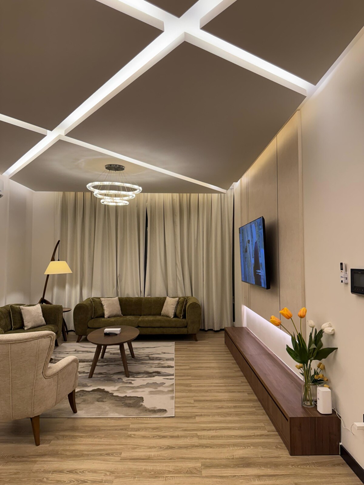 Vaknaðu við stórkostlegar sólsetur og útsýni yfir sjóndeildarhringinn. Þessi notalega og nútímalega íbúð er staðsett á 35. hæð og sameinar hlýju, stíl og þægindi með fallega hönnuðum innréttingum og hugsið í öllu. Þessi nútímalega eign er staðsett í Manama og er í minna en 15 mínútna fjarlægð frá líflegri menningu borgarinnar, mörkuðum, kaffihúsum við vatnið, menningarlegum áhugaverðum stöðum, vinsælum veitingastöðum og líflegu næturlífi. Íbúðin er fyrir ofan hávaða borgarinnar og er fullkomin fyrir friðsæla frí!