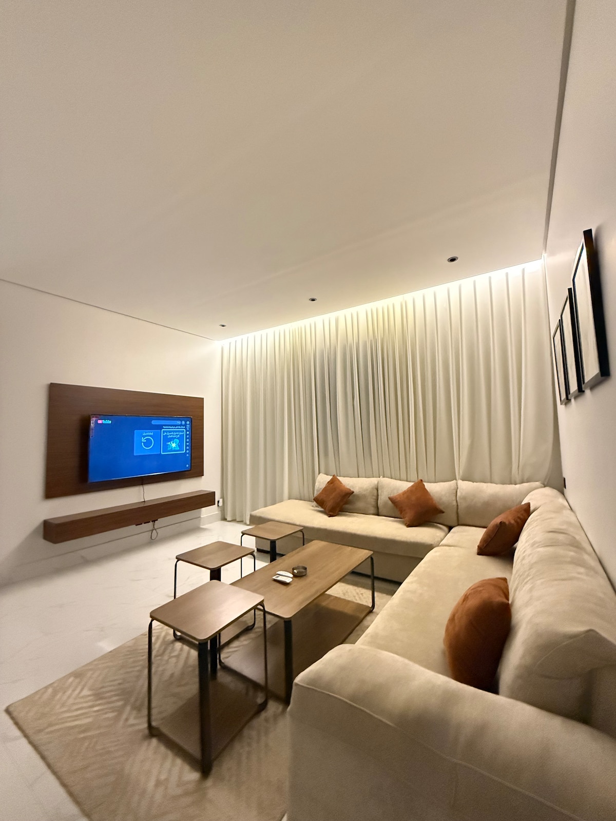 This unique place has a style all its own.A stylish and modern apartment with a unified design between the living room and bedroom. The space features cozy furniture and elegant decor that creates a relaxing atmosphere. Equipped with a 65-inch Smart TV with access to all major streaming platforms, and high-speed fiber internet. Enjoy a Nespresso coffee machine, electric kettle, and a compact kitchen with a stovetop and toaster for your daily needs. A perfect stay for both work and relaxation.