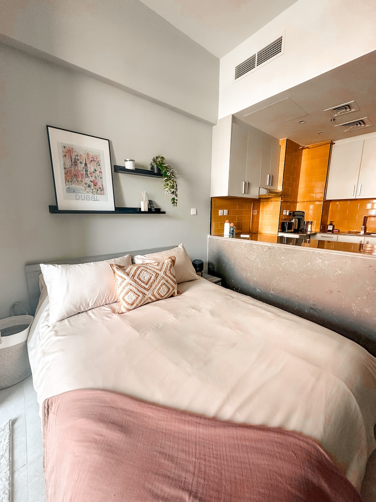 Stígðu inn í stórkostlegu lúxusstúdíóið okkar sem er ítarlega hannað til að bjóða upp á óviðjafnanlega upplifun fyrir pör eða einstaklinga. Um leið og þú kemur inn tekur glæsileg og nútímaleg eign á móti þér með vönduðum innréttingum og úthugsuðum smáatriðum. Slakaðu á í mjúku svefnherberginu, útbúðu sælkeramáltíð í fullbúnu eldhúskróknum eða slakaðu á í borðstofunni/stofunni með kaffibolla á meðan þú nýtur líflegra orku Dubai.