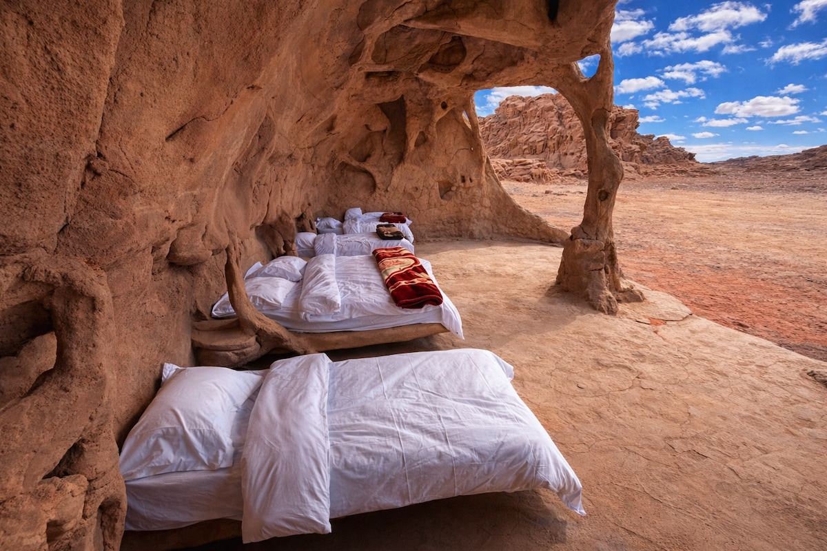 Upplifðu einstakt herbergi í hellum sem er skorið úr rauðu eyðimörkinni í Wadi Rum. Njóttu einkabaðherbergis, náttúrulegra steinmuna og víðs útsýnis yfir sólsetrið frá veröndinni. Þessi gististaður er umkringdur þögn og endalausum sandöldum og býður upp á þægindi, rómantík og ævintýri. Fullkomið fyrir ferðamenn sem leita að ógleymanlegu frí í eyðimörkinni undir stjörnubjörtum himni. Vaknaðu á rólegum morgnum í eyðimörkinni þar sem mjúkir litir fylla dalinn og skapa friðsælt andrúmsloft sem tengir þig við náttúruna á hverjum degi.