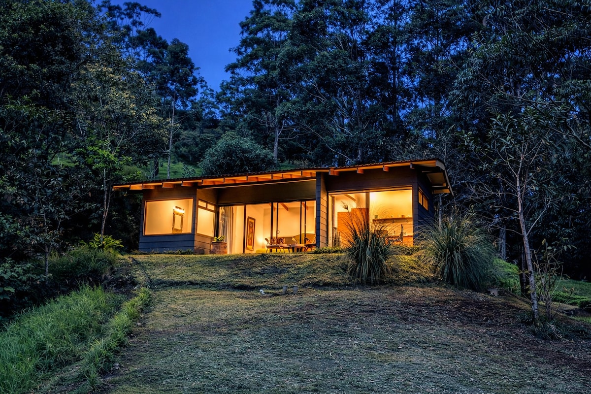 Verið velkomin í Tres Volcanes, lúxus viðar- og glerskála sem er staðsettur í 56 hektara búgarði. Byggð á hæsta punkti eignarinnar, þaðan sem þú getur séð Arenal, Tenorio og Rincón de la Vieja eldfjöllin við sjóndeildarhringinn. Þú munt geta hvílt þig með hljóðinu í ánni sem liggur við rætur fjallsins og vaknað til að fá þér kaffibolla á meðan þokan hverfur í gegnum trjátoppana. Bara í tíma til að ganga að mjólkurbúðinni og upplifa mjólk með höndum þínum og safna eggjum.
