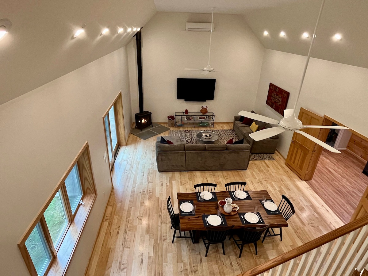Þessi byggingarperla með umlykjandi glergluggum tekur á móti gestum með einstaklega hönnuðu, óformlegu innanrýminu á 7 einkaskóglendi. Notalegt í kringum viðareldstæðið með gluggum frá gólfi til lofts sem bakgrunn, eða sitja á víðáttumiklu þilfari í kringum eldstæðið sem horfir á stjörnurnar. Notaðu sem heimahöfn fyrir frábæra menningar- og útivist á svæðinu eða njóttu náttúrunnar í lúxus án þess að fara að heiman. *Bókaðu í miðri viku á afsláttarverði IG@midcenturyoctagon