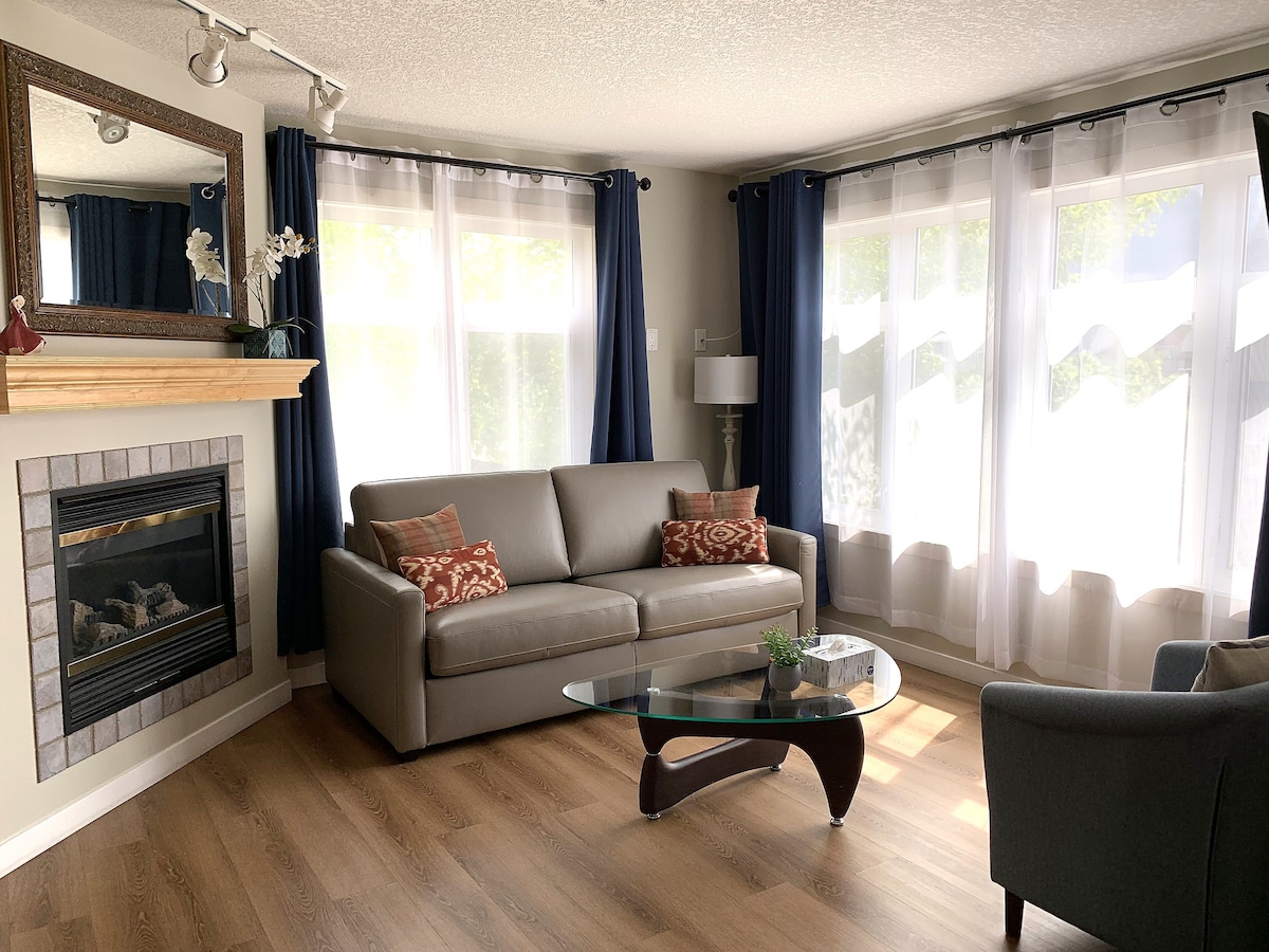Verið velkomin í friðsæla og stílhreina fríið ykkar í Canmore! Þessi íburðarmikla íbúð er aðeins í 10 mínútna göngufæri frá miðbænum þar sem verslanir, veitingastaðir og göngustígar eru rétt fyrir utan dyrnar. Slakaðu á við notalegan steinarofinn, leggðu þig í mjúkt king-size rúm eða bjóddu auka gestum í hágæða svefnsófa. Njóttu bjartrar og rúmgóðrar stofu, fullbúins eldhúss, þvottahúss í íbúðinni, ókeypis bílastæðis og 1 GB háhraða þráðlausa nets. Tilvalið fyrir ævintýri eða afslöngun í Klettafjöllunum.