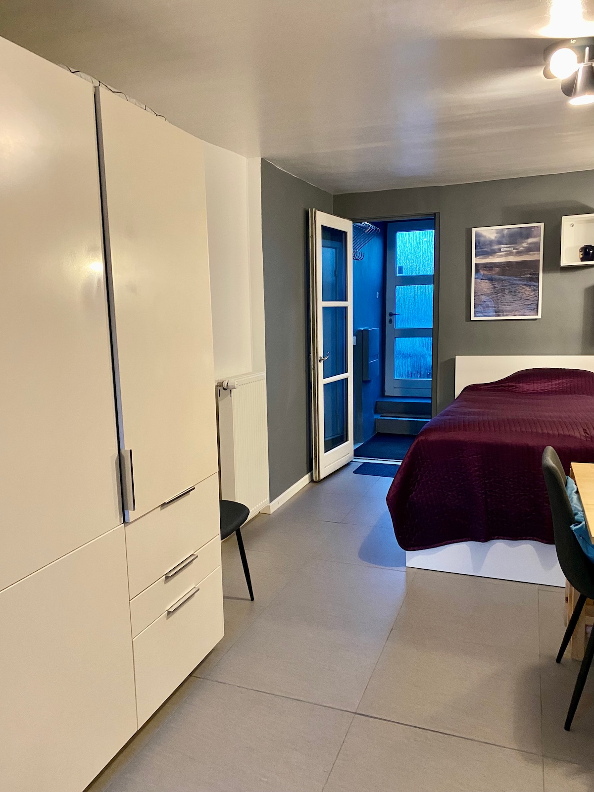 Falleg, björt og notaleg 2 herbergja íbúð í nýbyggðri villu með sérinngangi í rólegu íbúðarhverfi. Ókeypis bílastæði við dyrnar. Aðgangur að sér garði fyrir utan útidyrnar. Baðherbergi með sturtu með "regnvatnssturtu" og handsturtu. Svefnherbergið er með 2 einbreiðum rúmum sem hægt er að setja saman í stórt hjónarúm. Stofa/borðstofa með vel búið eldhús með ísskáp/frysti, örbylgjuofni og spanhelluborði Sófi og borðstofuborð/vinnuborð. Auðveld innritun með lyklaboxi.