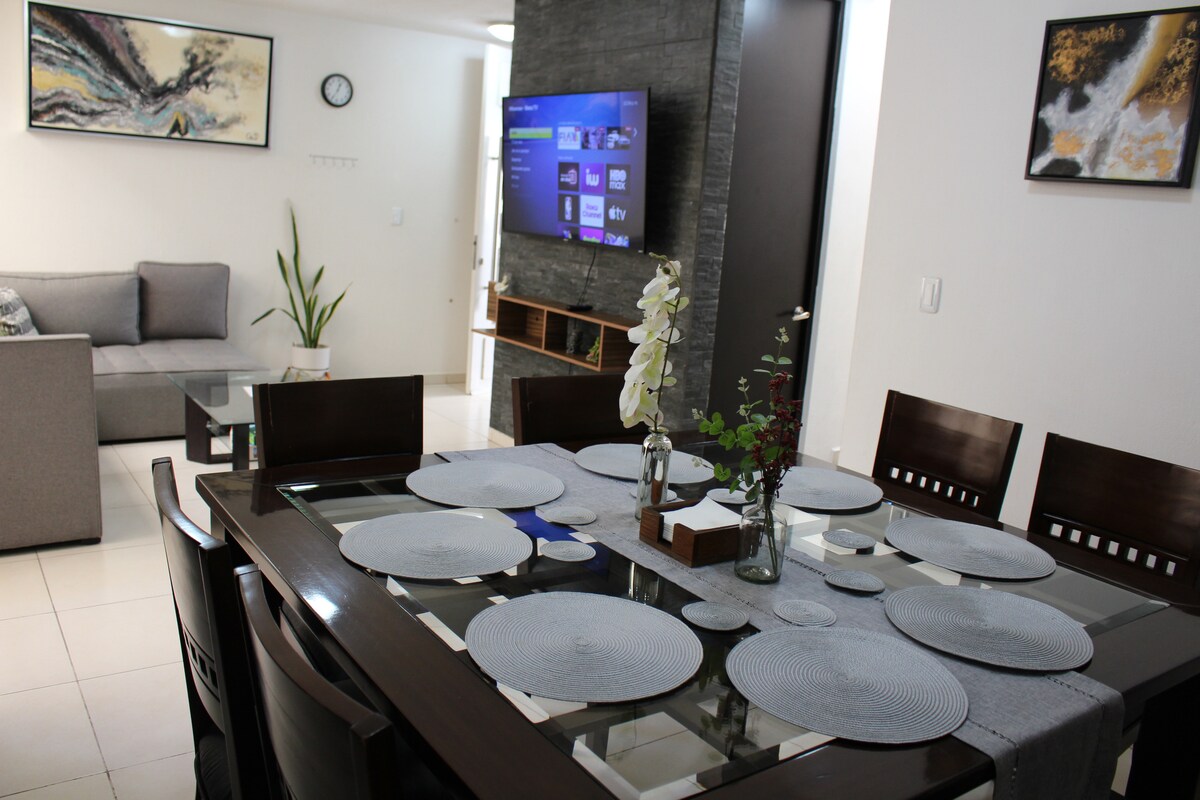 Notaleg og nútímaleg íbúð, með stýrðum aðgangi og öryggi allan sólarhringinn. Öruggt svæði. Við erum með frábæra staðsetningu! aðeins 8 mínútum frá Altaria Mall og 15 mínútum frá San Marcos National Fair. Við erum með 4 herbergi og 3 fullbúin baðherbergi, 5 rúm og 2 sófa. Snjallsjónvarp og þráðlaust net, skápar og snagar til afnota. Fullkominn staður til að slaka á og eyða frábærri dvöl í borginni Aguascalientes.