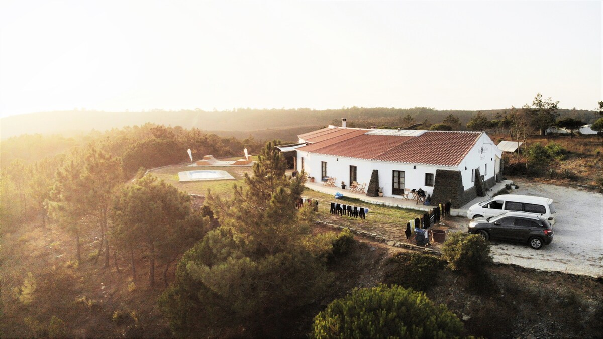 A huge and spacious rooms in a modern house, decorated in surf style. Buffet-breakfast is included. It's situated in the middle of Natural Park Costa Vicentina, with an absolutely stunning view over the ocean and forest. 6 Private rooms with private bathrooms. Amazing open terrace, wooden Yoga deck are great supplements for host yoga retreats. Most of the rooms have private terraces with access from the rooms. Large green lawn, swimming pool with the ocean view. Wooden skate ramp.