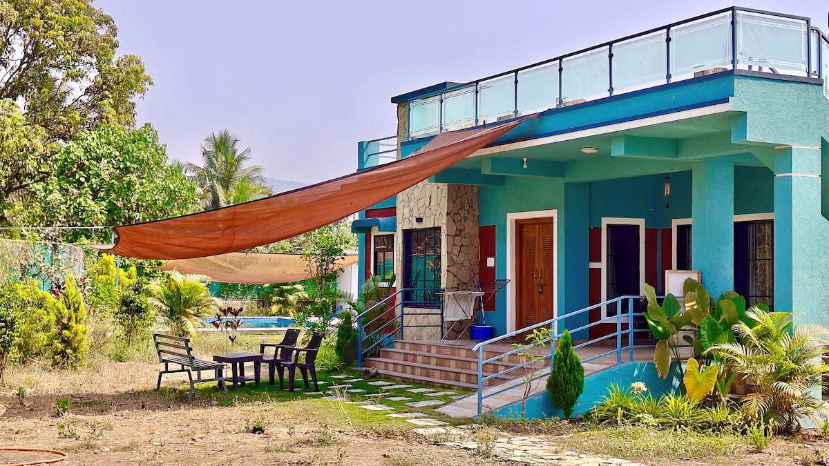 Fallegt rautt múrsteins- og steinhús byggt nýlega í hinu friðsæla, græna strandþorpi Konkan í Thal. Ströndin er í nokkurra mínútna göngufjarlægð frá eigninni okkar. Húsið er umkringt kókoshnetulundum, þroskuðum mangótrjám og fallegri grasflöt. Heimilið sem byggt er í hefðbundnum Konkan stíl hefur notað teakvið úr 100 ára gömlum bústað og öll efni og vinnuafl hafa verið fengin á staðnum. Gestir okkar munu njóta kyrrlátrar og rólegrar dvalar með staðbundnum elduðum máltíðum sé þess óskað. Þessi skráning er sameiginleg .