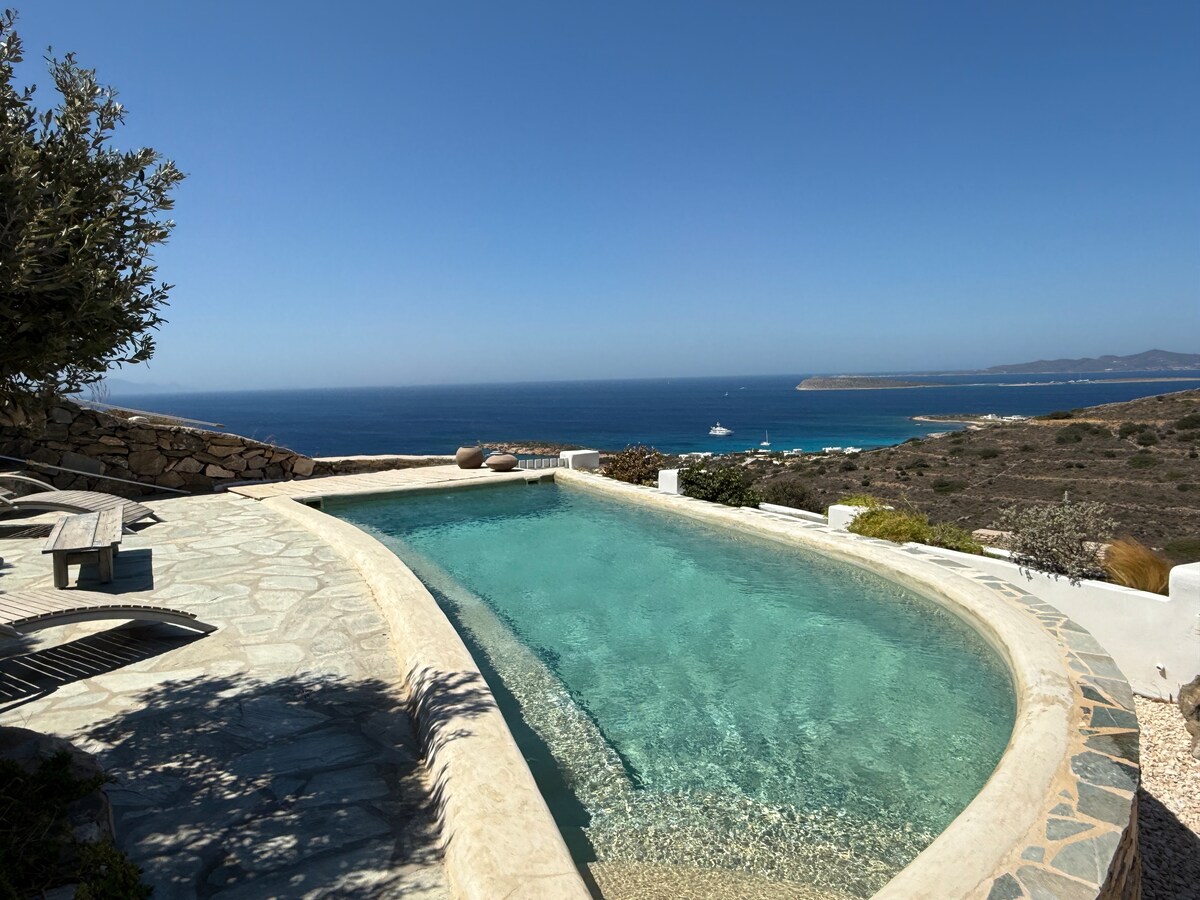 Évadez-vous à Paros et séjournez dans cette authentique maison des Cyclades, nichée dans un paisible domaine privé à moins d'un kilomètre de l'une des plages les plus belles de l'île. Superbes vues panoramiques sur la mer et des couchers de soleil inoubliables, cette villa est une véritable retraite estivale. Tout est non partagé, uniquement pour notre maison : - Jardin et piscine privés - Espace repas extérieur avec BBQ et plancha - Terrain de pétanque et jeu de fléchettes