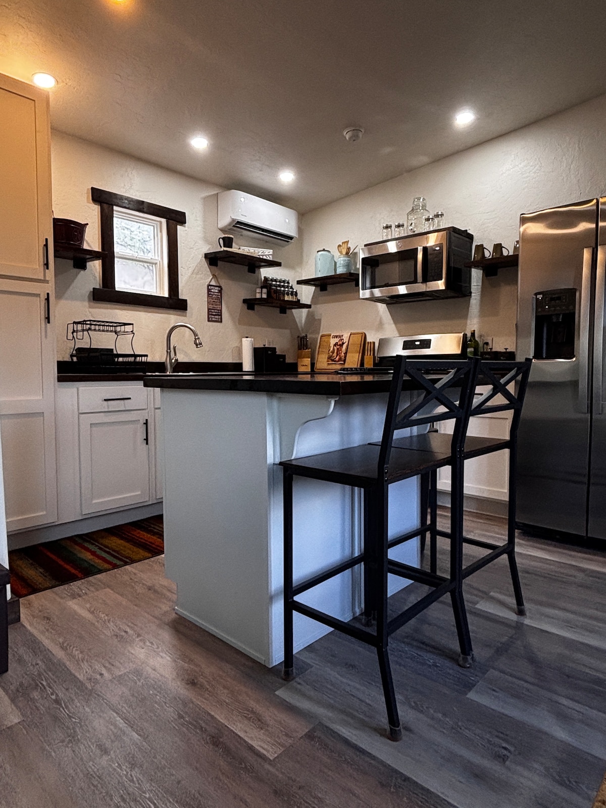 Þetta var upphaflega byggt á milli 1930 og 1950 og er það fyrsta fullklárað af fimm sögulegum kasítum sem ég hef verið að gera upp frá árinu 2021. Þessi eining er „The Whiskey“ og hér er fullt af skemmtilegum, gömlum vestrænum skreytingum og viskíinnréttingum. Þetta stúdíó er með king-size rúm með nýrri Tuft & Needle memory-foam dýnu, eldhúskrók og fulluppgerðu gömlu baðherbergi með baðkari. Þetta er heill helmingur af tvíbýlishúsi. Í hverju herbergi eru 2 hestabásar innifaldir í verðinu þegar það er í boði.