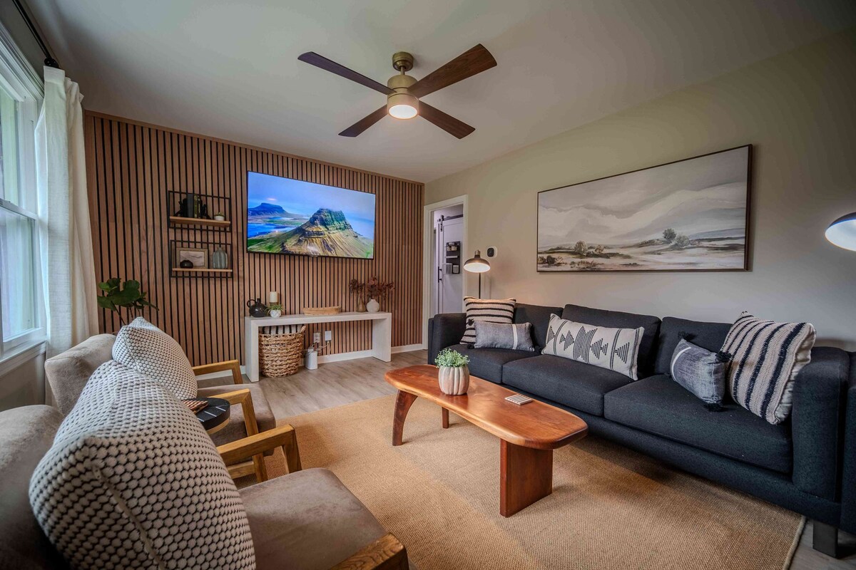 *15 mínútur frá LAKEPOINT*, 5 mín frá I75 og 10 mín frá miðbænum og matvöruverslunum. Þessi fallega, nýbyggða kjallaraíbúð er staðsett bak við aðalveginn og umkringd þroskuðum trjám sem skapa friðsælt og persónulegt umhverfi. Fullkominn staður til að slaka á og slaka á með eldstæði. Lyklalaus inngangur, engir stigar og opið skipulag ásamt glæsilegum borðplötum úr kvarsi og tækjum úr ryðfríu stáli gera þetta að heimili þínu að heiman.