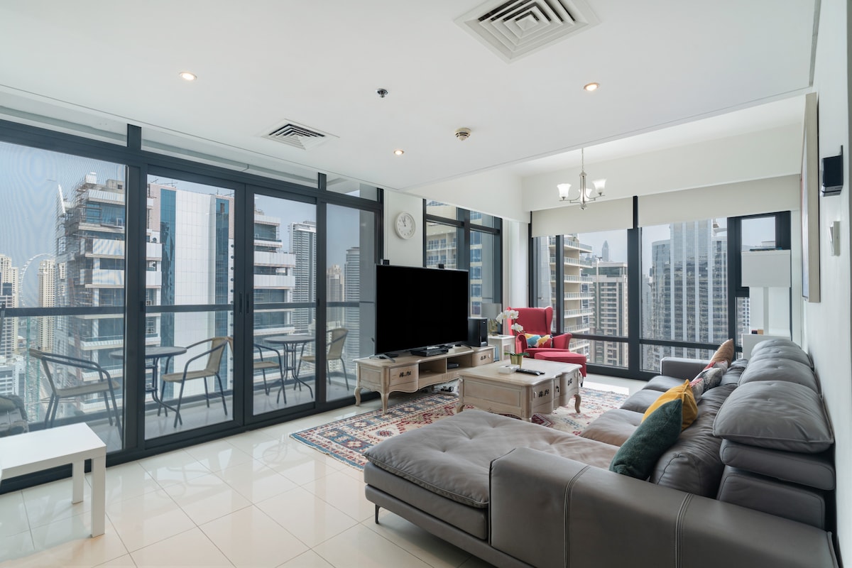 Verið velkomin í glænýju 4 rúma íbúðina (1 king-size rúm og 1 mjög þægilegur XL svefnsófi) og 1,5 baðherbergi í hjarta Dubai Marina. Þú finnur lúxusafdrep í göngufæri frá sjónum, bestu veitingastöðum, verslunum, afþreyingu, verslunarmiðstöðvum og áhugaverðum stöðum. Farðu um borgina eða á ströndina frá þessum besta stað og slakaðu svo á í nútímalegu íbúðinni þar sem glæsileg hönnun og ríkulegur þægindalisti gerir þig orðlausan!