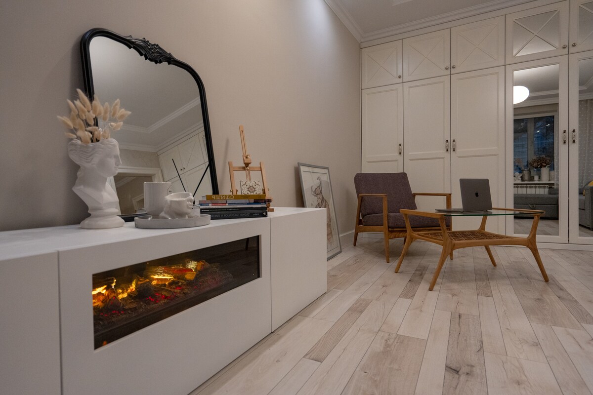 Стильная квартира в самом сердце Алматы — на набережной Esentai, рядом с Esentai Mall, парком и лучшими ресторанами города. Уникальная фреска, уютный камин, дизайнерский декор и вид на горы с 4 этажа создают атмосферу уюта и вдохновения. Полностью оборудованная кухня, техника, винные бокалы и редкие сорта чая. Для гостей при бронировании от 5 ночей — бутылка казахстанского вина Arba Wine в подарок. Пространство 48 м² идеально подойдёт для пары, творческой поездки или путешествия в одиночку.