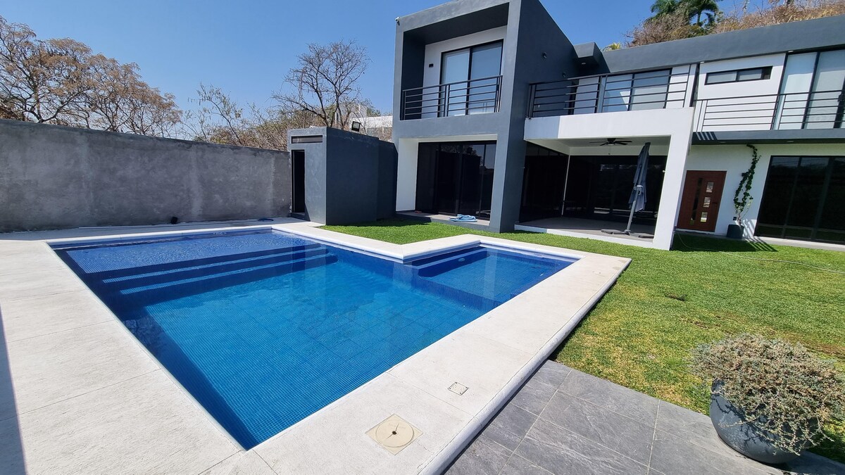 Slakaðu á í þessu fallega heimili í iðnaðarstíl í Xochitepec-golfklúbbnum. Hér er eigin sundlaug og garður svo að þú getir notið hans í einrúmi með vinum þínum og/eða fjölskyldu og gæludýrum. Fullkomið fyrir heimaskrifstofu!