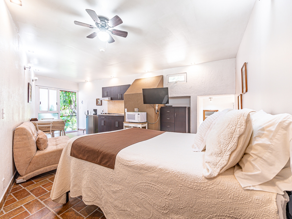 Íbúð í Tizapan San Ángel fyrir par, með möguleika á annarri stúdíóíbúð/herbergi með rúmi. Hún er ný og staðsett á þægilegum stað—búið ykkur undir Heimsmeistaramótið á Banorte-leikvanginum (9 km / 5,5 mílur), nálægt ITAM, UNAM, Hospital San Ángel Inn, Plaza Loreto, laugardagsmarkaðnum og kínverska sendiráðinu. Auðvelt að komast um á bíl, með Metrobus eða í göngufæri. Með vel búðu eldhúsi og Interneti. Bílastæði fyrir lítinn bíl og flókið aðgengi.
