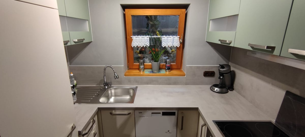 Njóttu ánægjulegrar dvalar á rólegum stað fyrir gönguferðir, hjólreiðar, vinnu eða bara afslöppun. Íbúðin er með sérinngang og verönd. Opið fullbúið eldhús (ofn, örbylgjuofn, kaffivél) býður upp á pláss fyrir fjölskyldu eða allt að fjóra með stóru borðstofuborði. Stofan er útbúin sem samgönguherbergi að sturtunni og salerninu með skrifborði og öðrum svefnsófa.